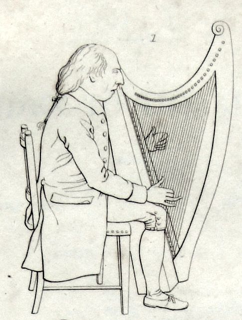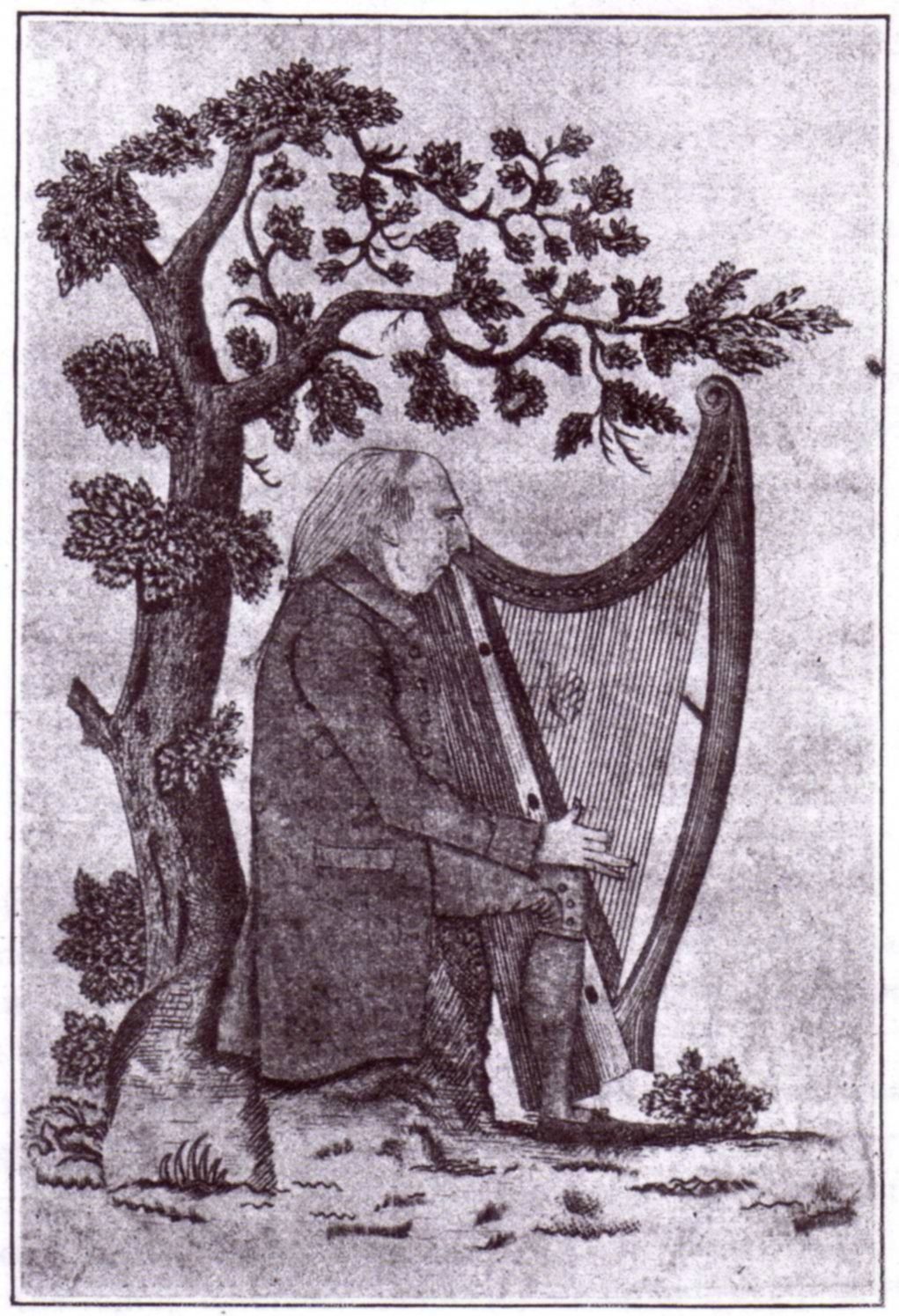 There is an 18th century oil painting by Conn O’Donnell, in the National Gallery of Ireland, which is often said to be of Arthur Ó Néill, though I don’t think this is true; the face looks different, and he has a different harp. The painting is currently in very poor condition and the National Gallery has been unable to supply me with a colour photograph of it. Breandán Breathnach printed a black-and-white copy of the portrait in Ceol, Winter 1963, where he said it was of Cormac Ó Ceallaigh, but I don't know the reason for this identification. A black-and-white reproduction was also printed in Early Music May 1987 (frontis) where it was identified as Arthur Ó Néill, and similarly also in Collette Moloney, The Irish music manuscripts of Edward Bunting, ITMA 2000, and Nicholas Carolan, The most celebrated collection of Irish tunes, ITMA 2010. Many thanks to the Irish Traditional Music Archive for supplying me with a scan of the reproduction in Ceol and giving me permission to reproduce it here. |
