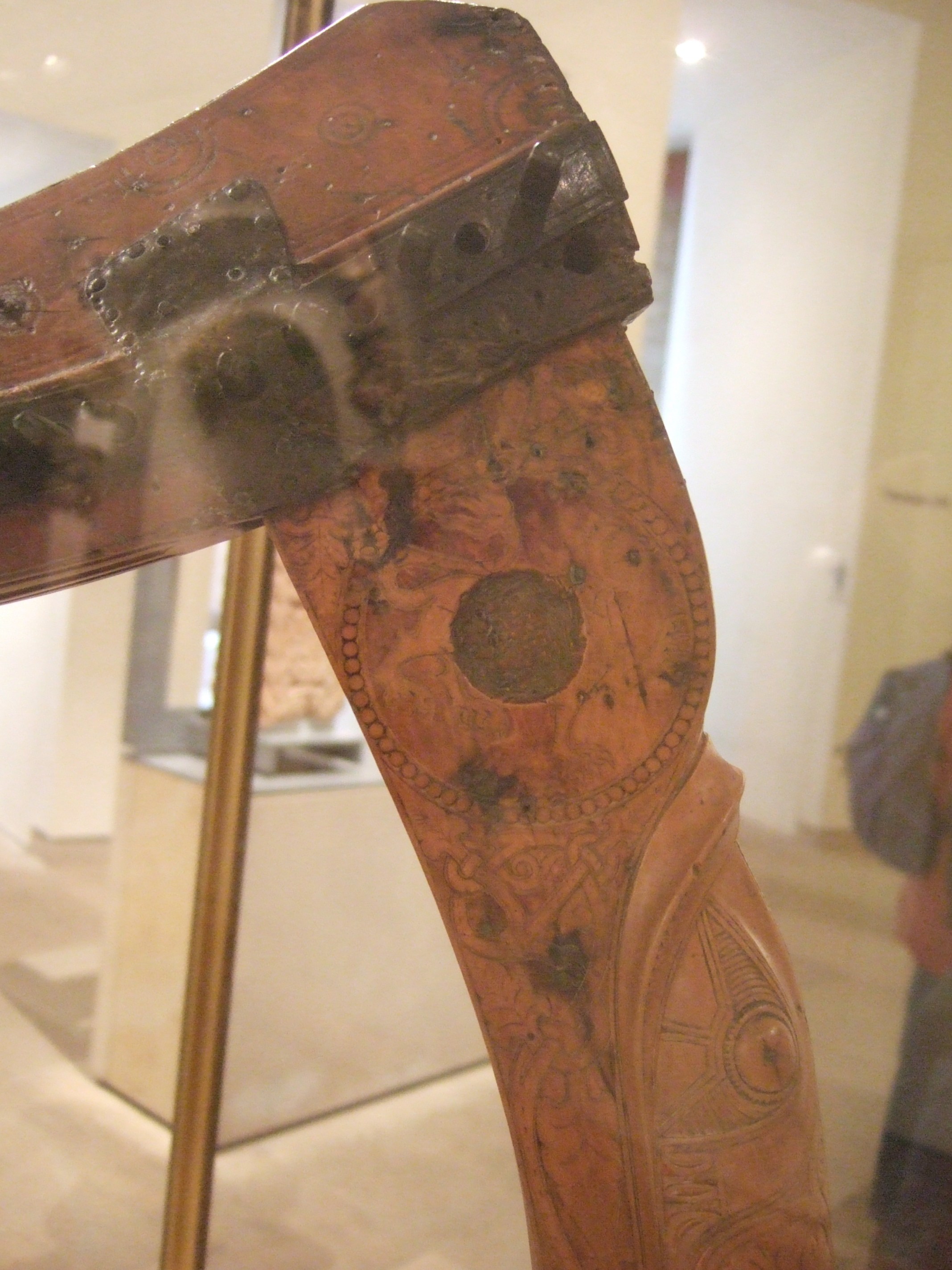 Like most of the old harps, the Queen Mary harp was modified by a later owner. In this case the addition is obvious and simple; an extra bass string was added. There is a hole drilled in the neck beneath the metal band, for a 30th tuning pin (now lost) and as there was no space on the soundbox for a 30th shoe, an iron staple was inserted into the gap that had opened up between the pillar and soundbox. Presumably the old medieval gamut was no longer satisfactory for 17th/18th century baroque playing styles!