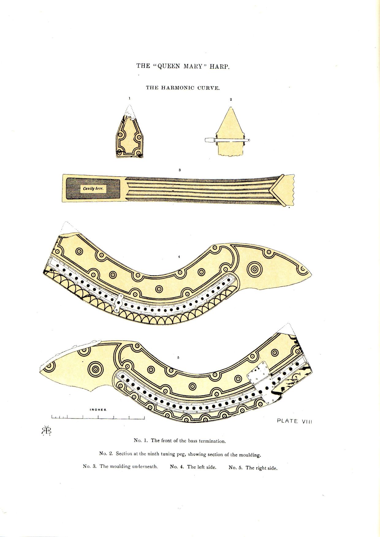 The neck of the Queen Mary harp is delicately outlined with lines and circles which look similar in technique to the soundboard lines. (Picture from RBA 1904, click to enlarge). This is a very similar decorative scheme to the underlying layer of decoration on the neck of the Trinity College harp.