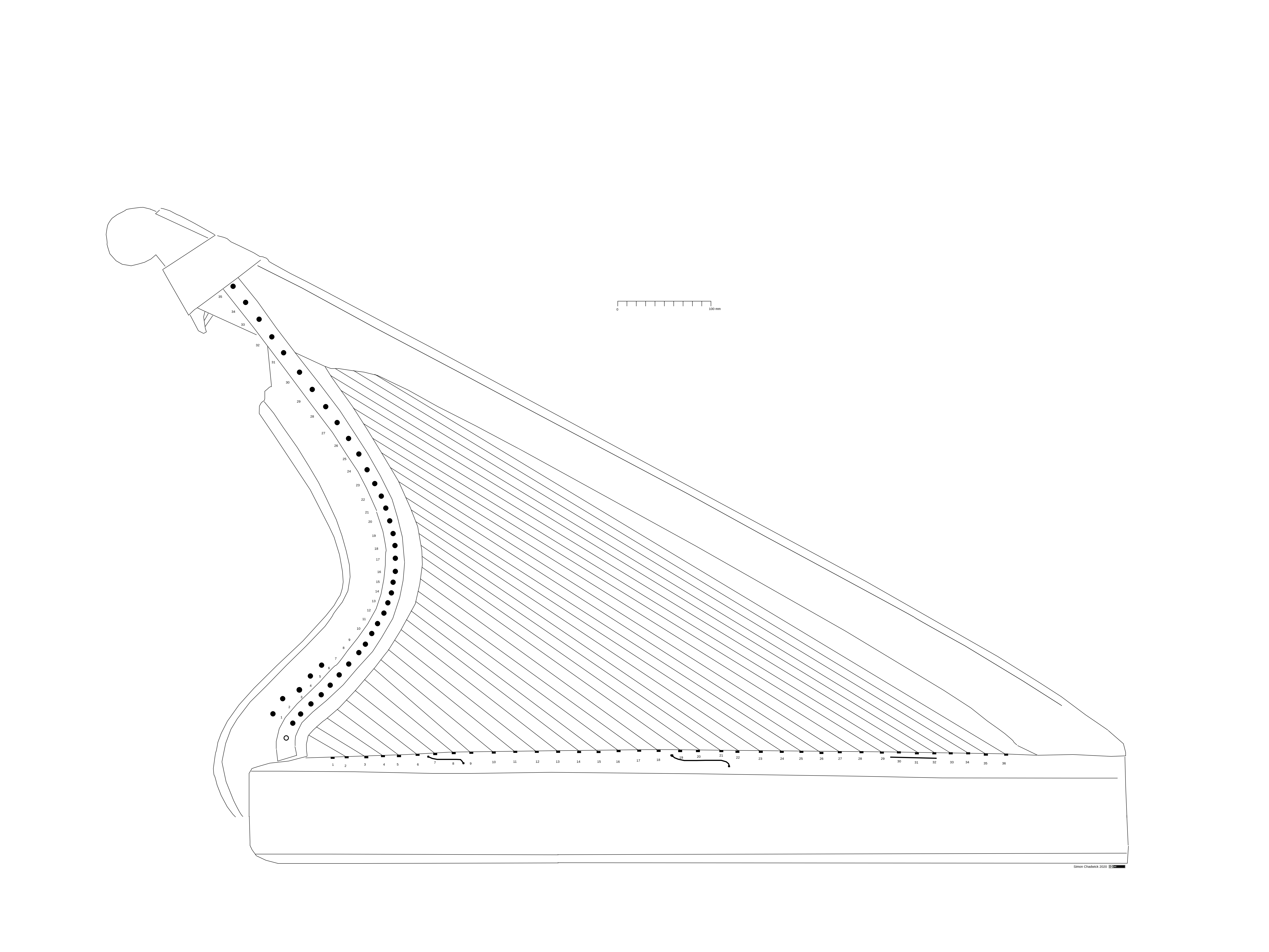 I have also made a speculative string chart based on the measurements from this drawing, showing the harp with 35 strings, from bass GG up to treble g''', and with five strings below cronan G. Click here for PDF string chart. The chart also includes a chart for 36 strings, with the inclusion of a speculative 36th pin that may be concealed behind the iron band in the bass.