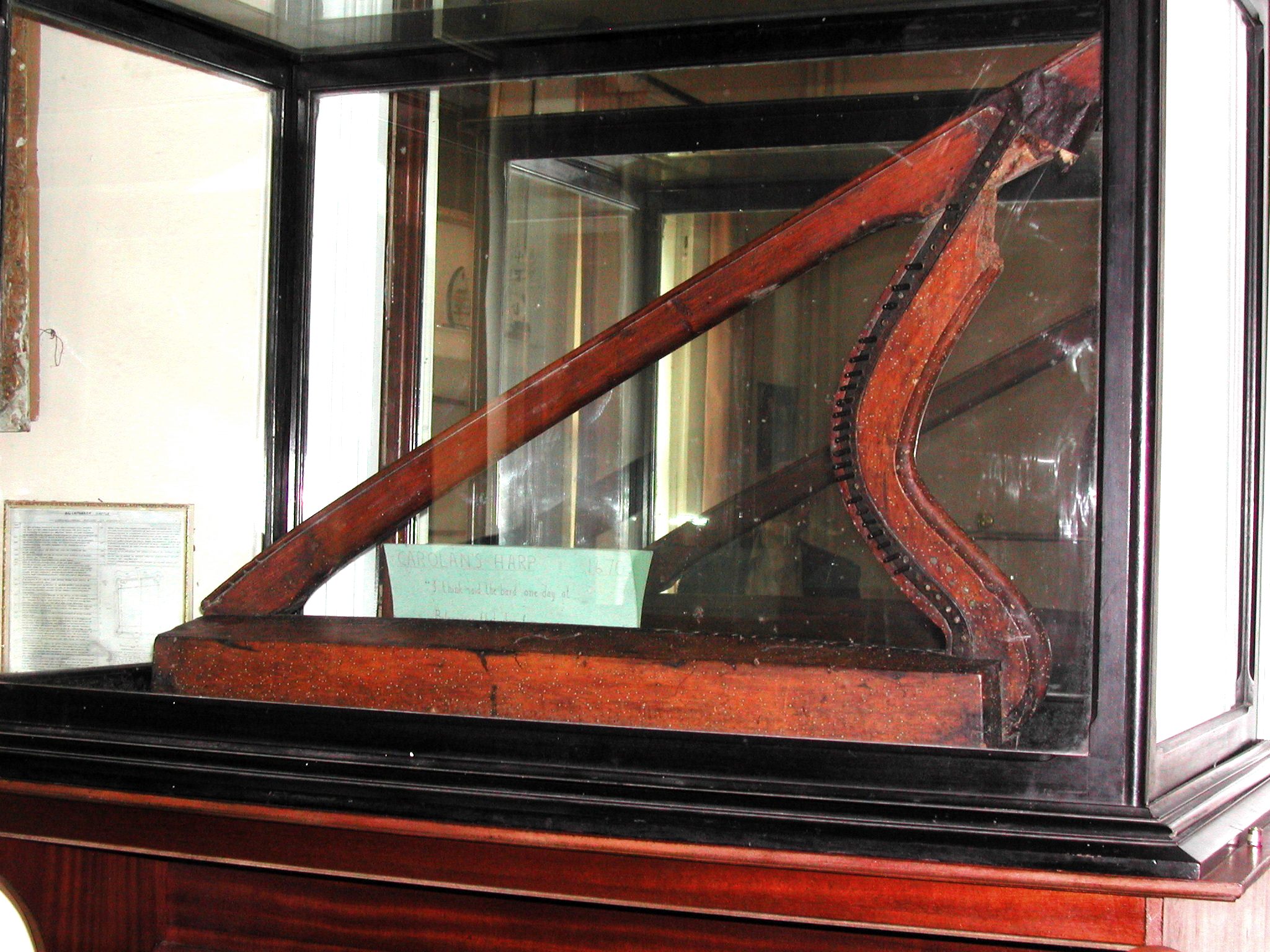 This harp is traditionally said to have belonged to Turlough O'Carolan (1670 - 1738). It is not well studied; it is not listed in either of the two main authorities, R.B. Armstrong (1904) or Joan Rimmer (1969).